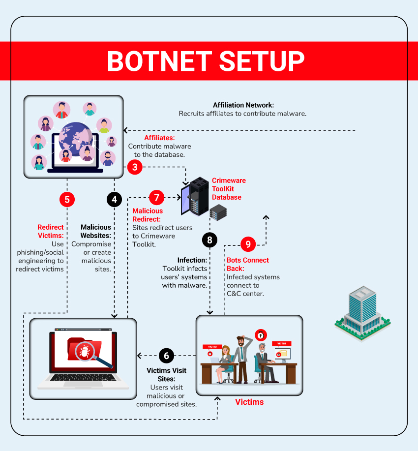 Botnets significantly amplify cybercriminal operations by facilitating activities such as malware distribution, phishing campaigns, and launching massive Denial of Service (DoS) or Distributed Denial of Service (DDoS) attacks. Cybercriminals deploy malicious software like Trojans, viruses, or keyloggers to compromise systems and recruit them into botnets, often without the system owners’ knowledge. These covert networks are challenging to detect and dismantle, as the Command & Control servers obscure the original attacker’s identity and intentions.