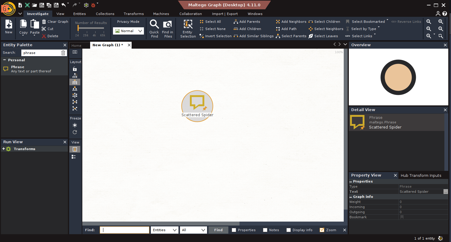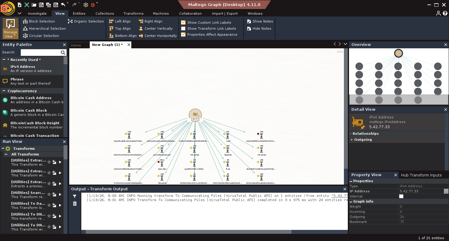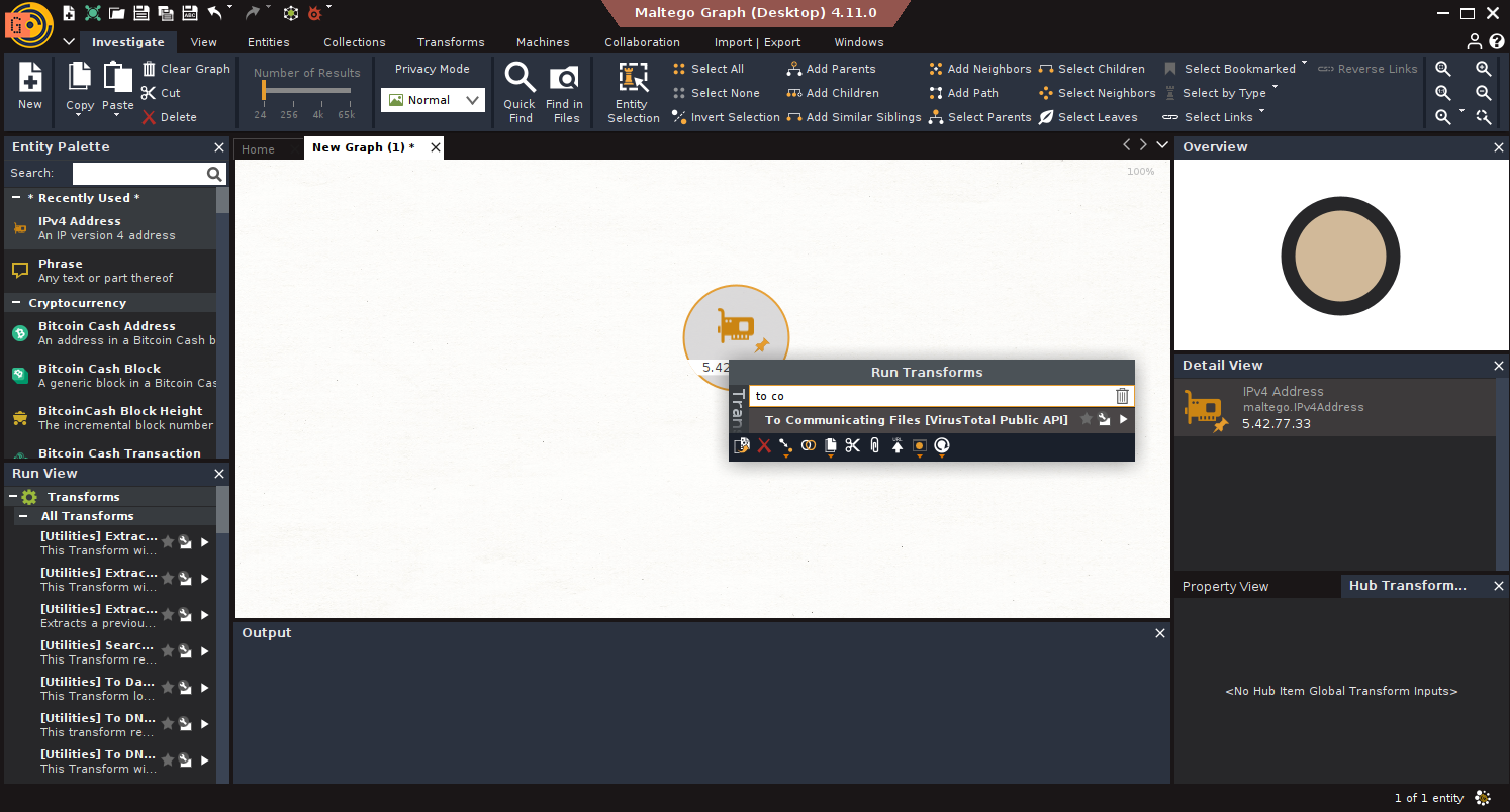 1. Entities: Everything in Maltego begins with an Entity, domain, IP, email, BTC address, etc. Maltego comes with standard ones, and you can create custom entities.