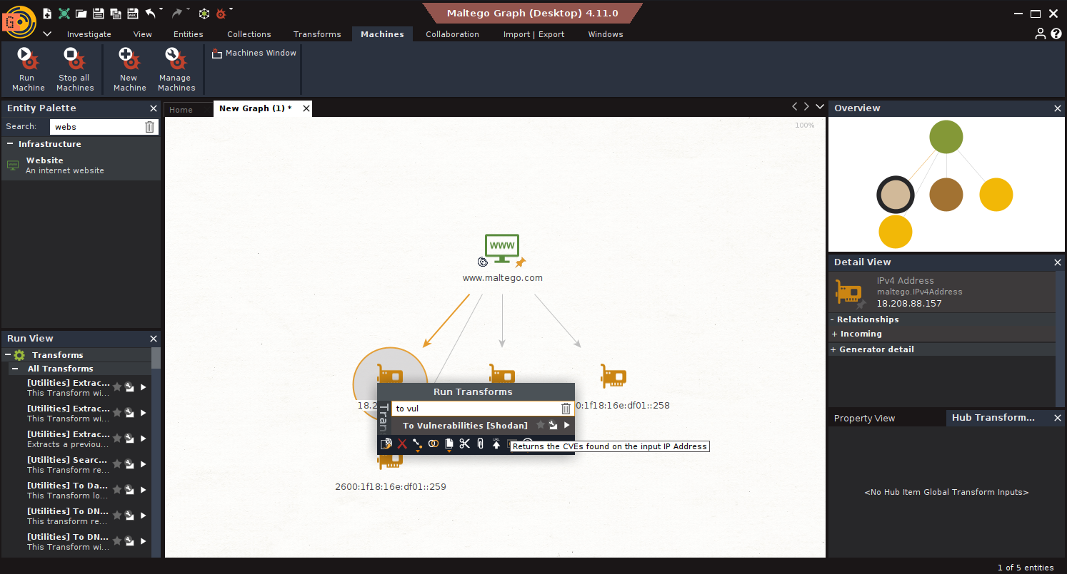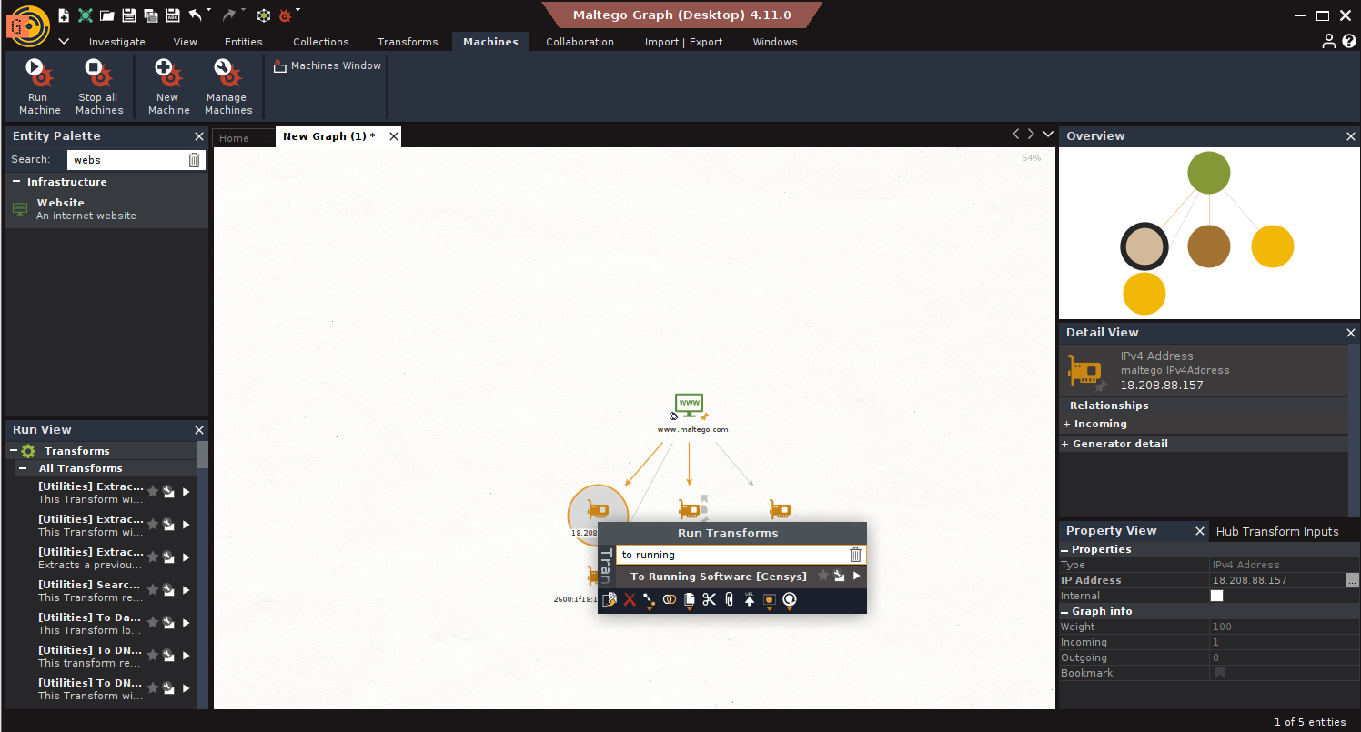 4. Machines: Automated sequences of Transforms. Useful for initial triage, like running a standard set of lookups on any new IP address. Saves clicks, but use judiciously; it can generate noise.