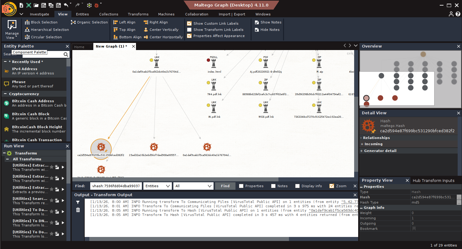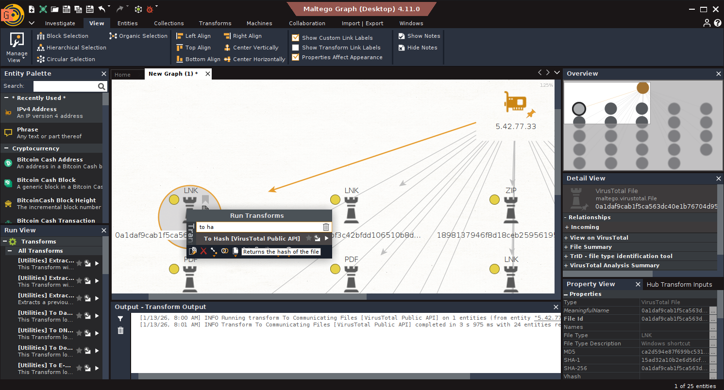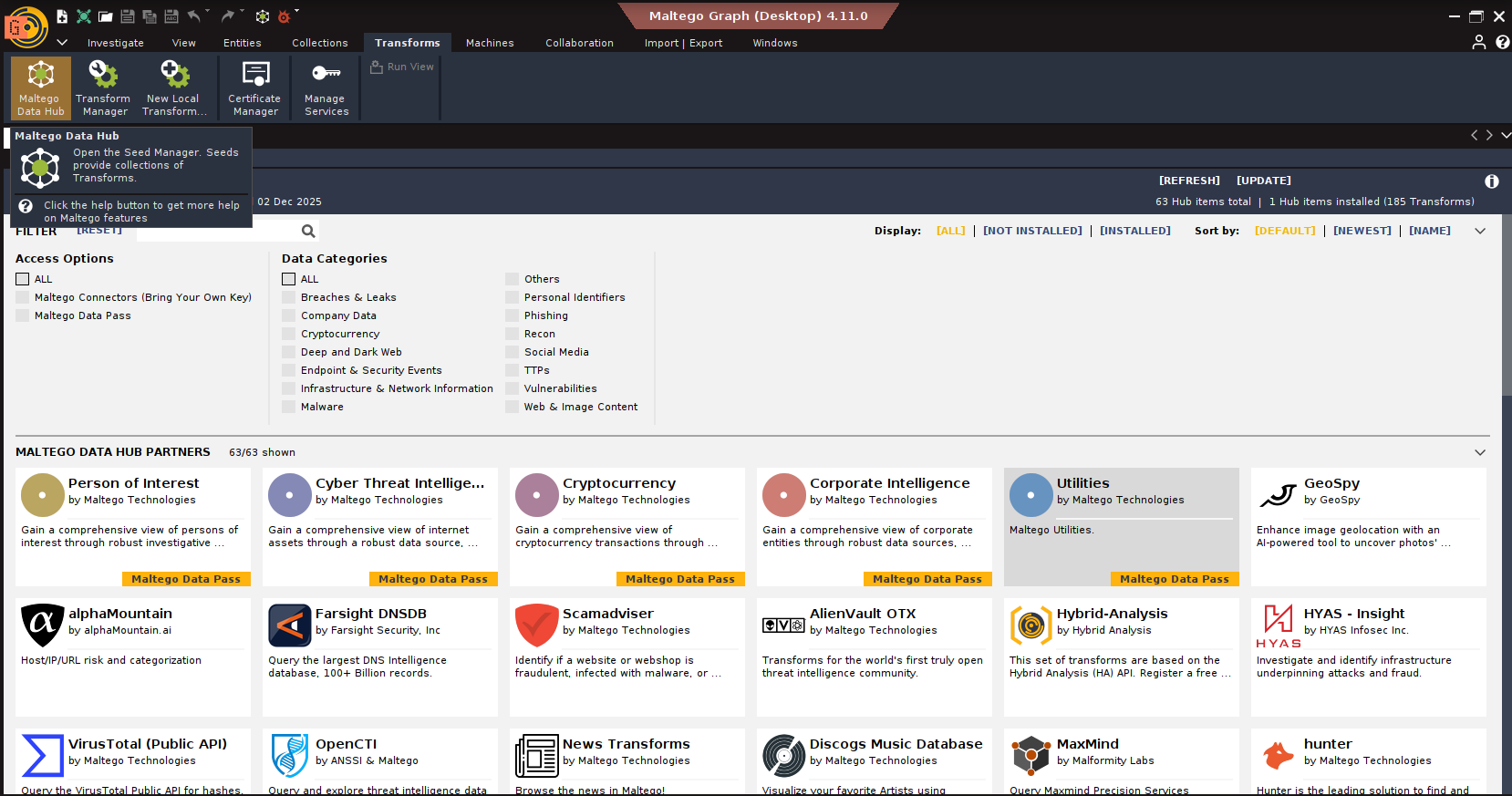 3. Transform Hub: Your gateway to more power. This is where you find and install Transforms from Maltego Technologies, trusted partners (like VirusTotal, Shodan, Recorded Future, CrowdStrike, Intel471, RiskIQ, Cisco Threat Grid, MISP, ATT&CK, etc.), and the community. Many require API keys, and some are paid. Choose wisely based on your CTI needs and budget.